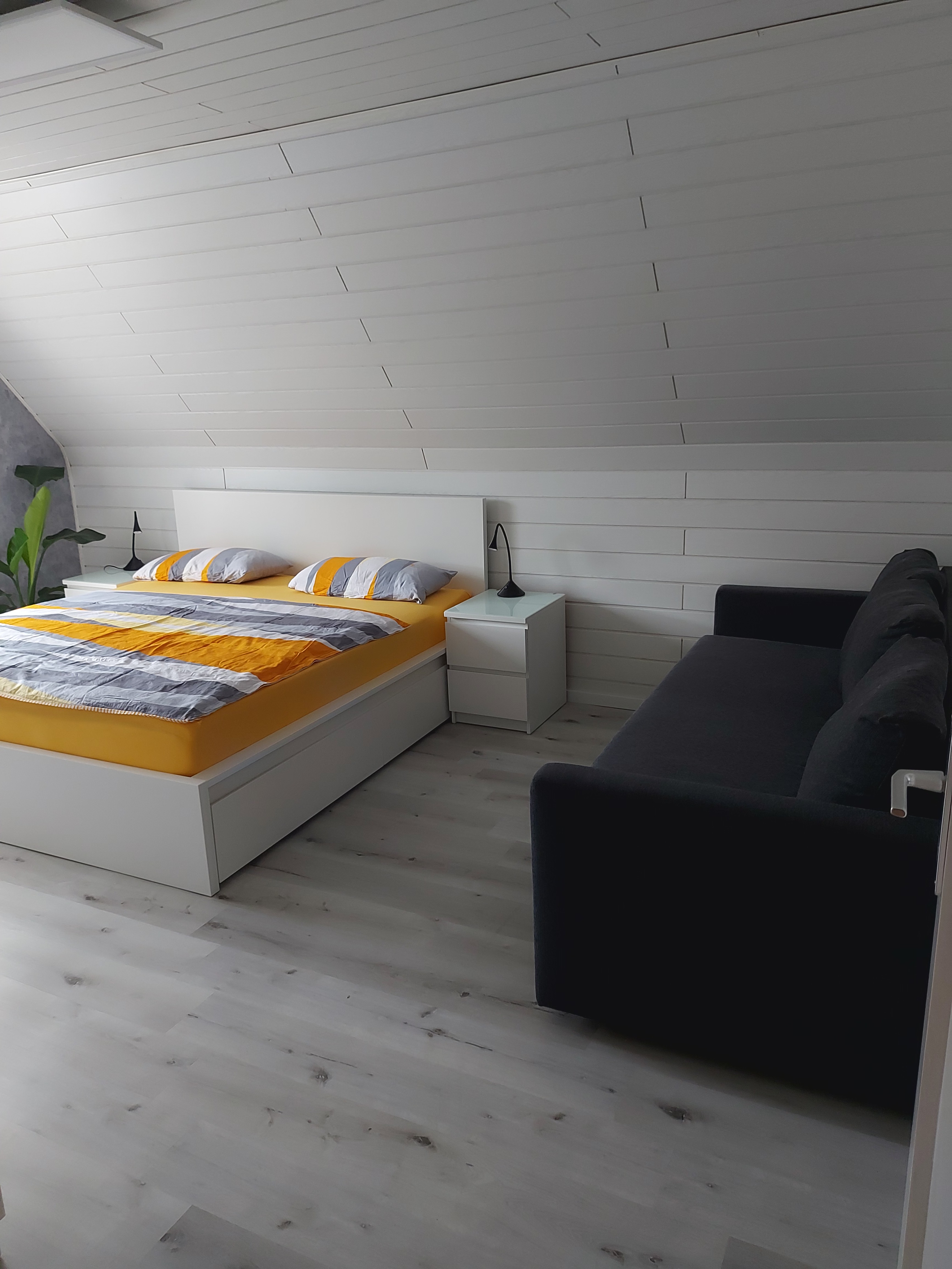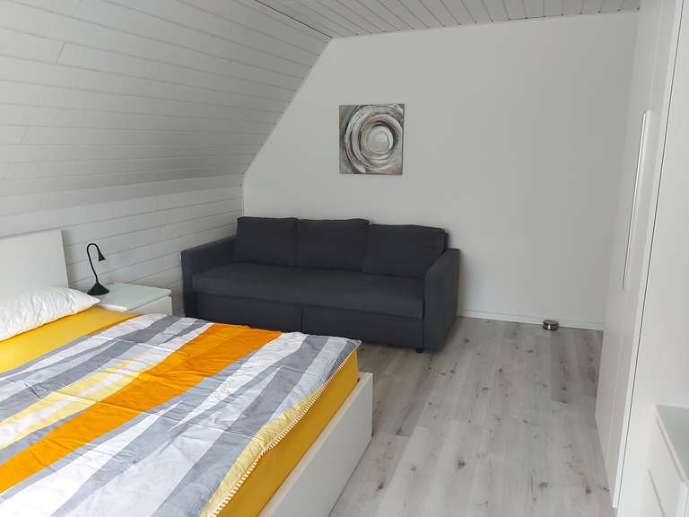 Das geräumige Hauptschlafzimmer befindet sich im Obergeschoss. Der Blick aus dem Fenster ist auf den, mit verschiedenen Stauden bewachsenen, Vorgarten gerichtet. Das Schlafzimmer bietet ein Doppelbett, ein gemütliches Sofa (ausziehbar) und eine Schrankwand mit ausreichend Stauraum für Alles was Sie für einen erholsamen Aufenthalt benötigen.